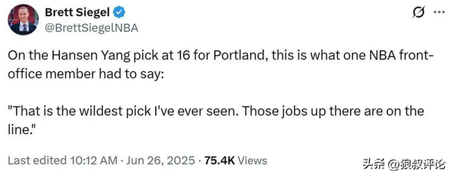 杨瀚森被选中的时间段,有美国记者给出了D的评级,认为开拓者的管理层会因此丢了工作的言论。