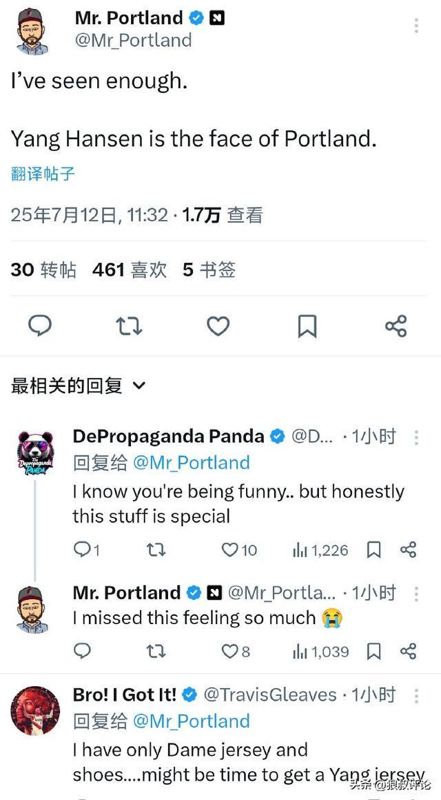 开拓者媒体Mr. Portland发文:“我已看出来了。杨瀚森是开拓者的门面,杨疯狂2025。